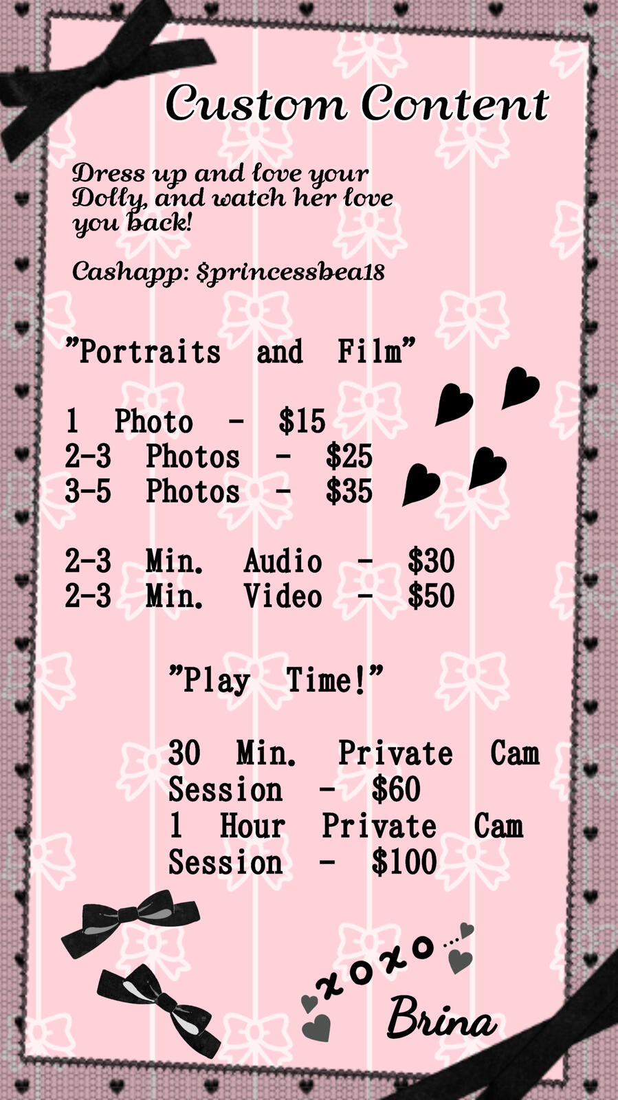 This service is personal time for just the two of us! Dress me up, have tea, dinner, or take me out with you! Service is for 1-2 hours.
